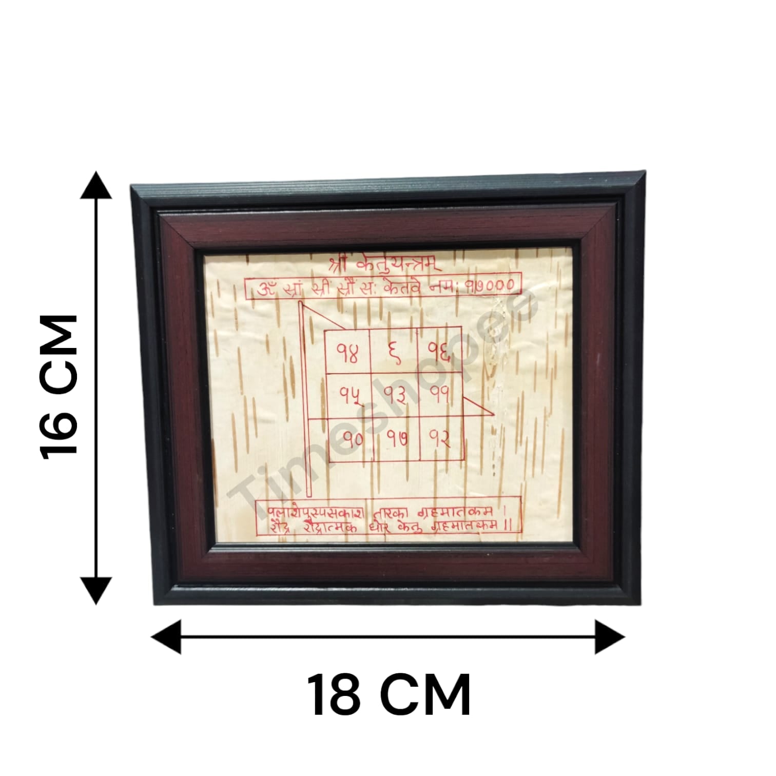 Transform your spiritual practice with the Ketu Yantra meticulously crafted on Bhojpatra and framed for ease of use. This sacred yantra, representing the powerful influence of Ketu, is a significant tool in Vedic astrology and spiritual rituals. The yantra is designed to harness the energy of Ketu, a celestial body known for its transformative and spiritual benefits.